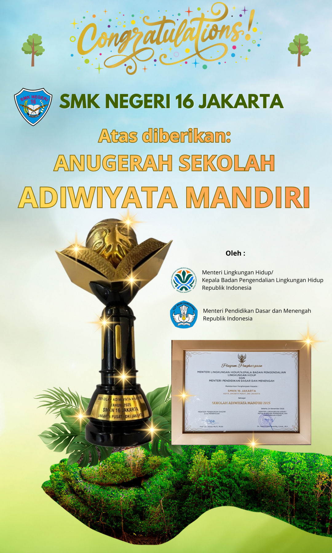 SELAMAT ATAS PENGANUGERAHAN SEKOLAH ADIWIYATA MANDIRI SMKN 16 JAKARTA